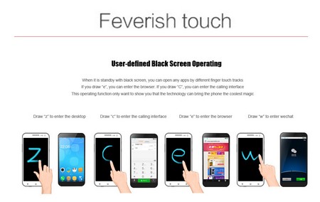 Tính năng nổi bật trên nền tảng Zopo OS đó là hỗ trợ nhận diện chuyển động tay người dùng. Theo đó nếu người dùng lướt ngón tay theo hình chữ “C” trên màn hình sẽ kích hoạt một ứng dụng trên điện thoại (được thiết lập trước), chữ “e” để kích hoạt trình duyệt hay chữ “w” để kích hoạt ứng dụng chat…