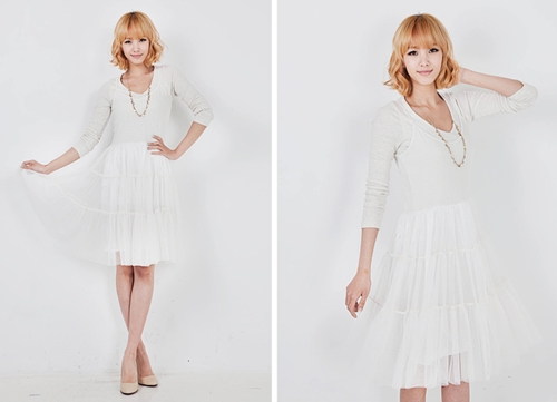 Nếu tone màu đen mang lại cho bạn vẻ cá tính và bí ẩn thì tone màu trắng lại giúp bạn dễ thương, xinh xắn như một nàng công chúa. Bạn có thể chọn váy mang tone màu trắng tinh khôi như cô phù thủy nhỏ Selena hay váy trắng pha sắc hồng như Park Min Young. Màu váy như của Park Min Young khá nịnh da nên bất kì bạn nào cũng có thể diện được đấy.