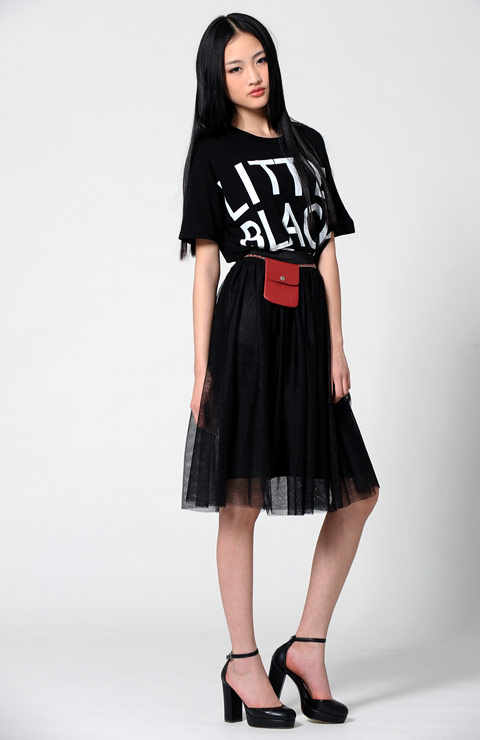 T-shirt đen in chữ trẻ trung, chân váy midi dáng xếp nếp chất liệu voan, kết hợp giày Mary Janes tông xuyệt tông, cuối cùng, bạn đừng quên mang theo chiếc túi da màu nâu sáng làm điểm nhấn đáng yêu cho bộ đồ nhé.