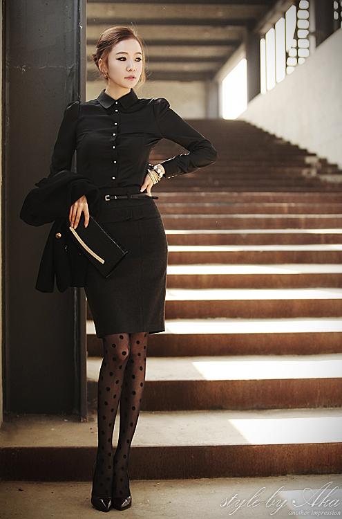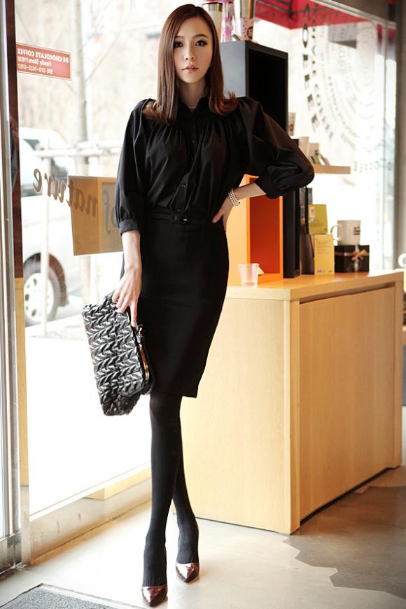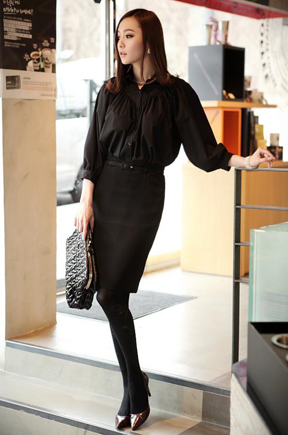 Cả một cây đen với áo sơ mi đơn giản và chân váy thích hợp với