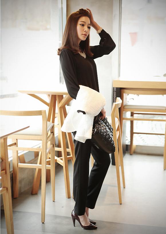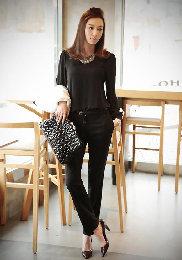 Áo voan mềm mại sơ vin với quần âu cùng tone đen khiến dáng bạn thanh mảnh