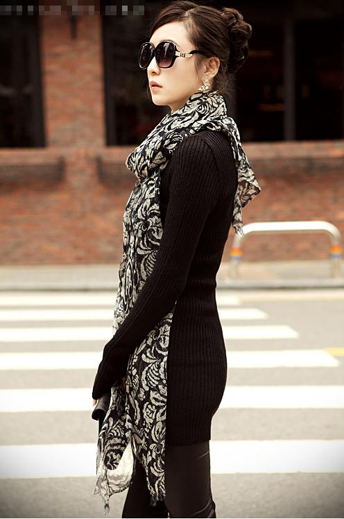 Chiếc áo len ôm dáng dài khoe dàng thon gọn, kết hợp cùng quần đen ôm bó sát