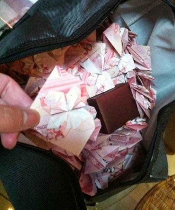 Điều đặc biệt là các trái tim hồng này đều được gấp bằng tờ 100 tệ - mệnh giá lớn nhất của tiền giấy Trung Quốc. Sau khi chuẩn bị xong, người chồng đã tìm một anh bạn thân mà vợ không biết mặt, đóng giả làm người đưa thư, gọi điện cho vợ ra nhận quà. Ước tính giá trị của hộp “bưu kiện” này khoảng 172 triệu đồng.