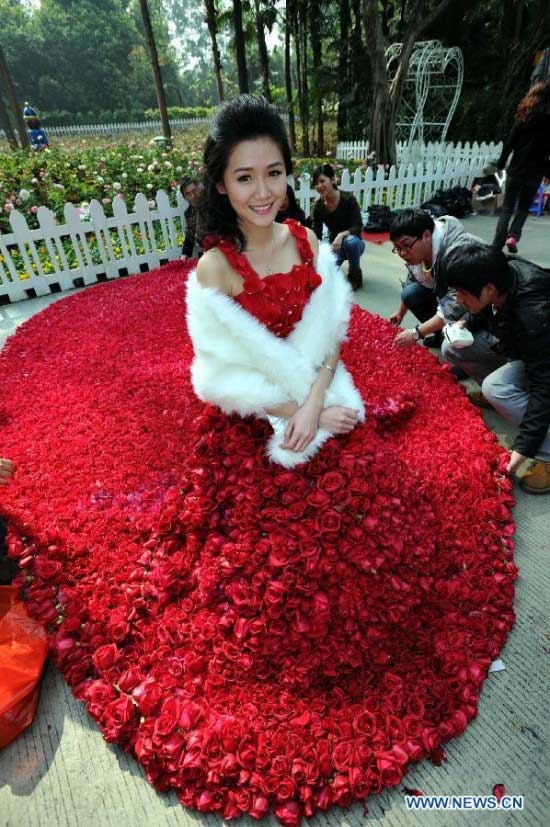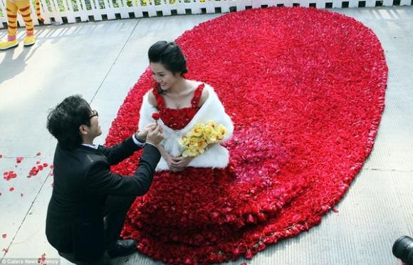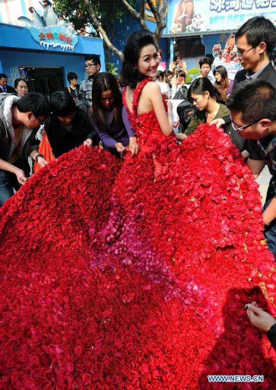 Nghe qua, ai cũng tưởng đó là câu chuyện thần tiên nhưng thực tế là nó đã xảy ra ở Quảng Đông, Trung Quốc năm 2012. Một anh chàng lãng mạn si tình đã đặt làm một chiếc váy kết từ 9.999 bông hồng tặng người mình yêu và để cầu hôn cô.