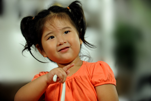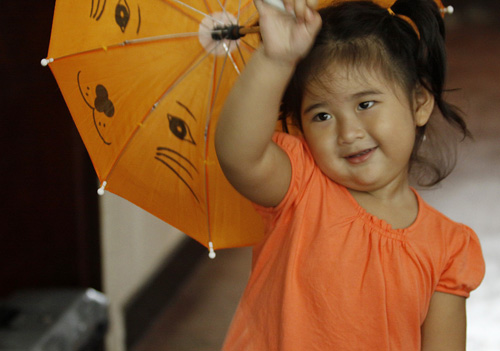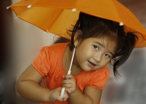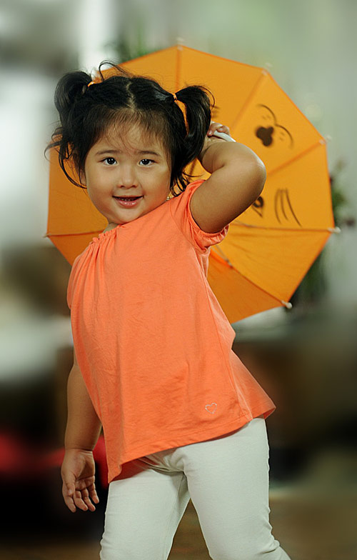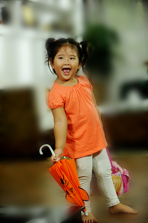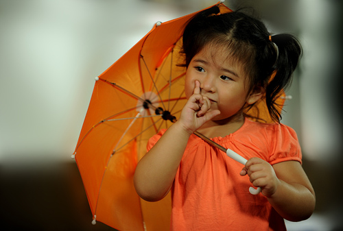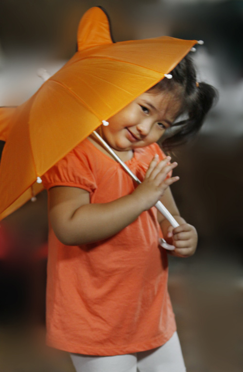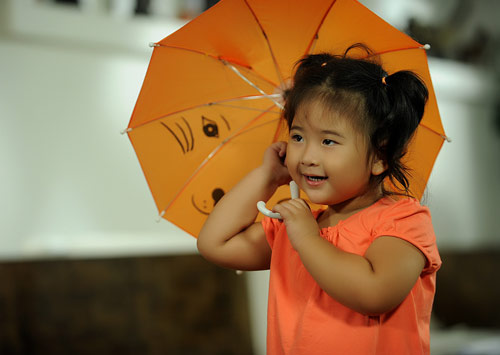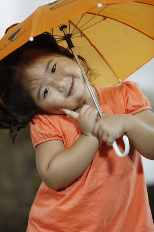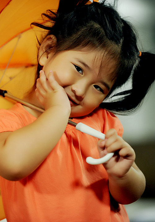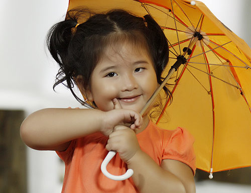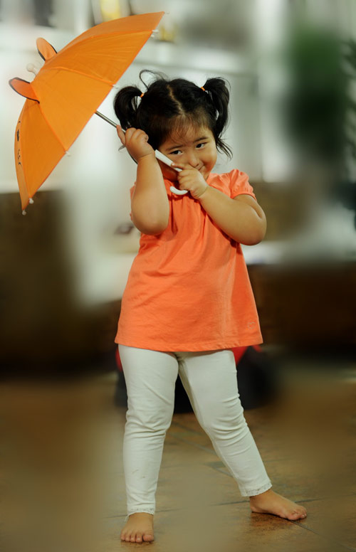 Trong giờ giải lao, sẵn cây dù đem theo, khi được yêu cầu cười tươi để bác phó nháy chụp hình, bé tỏ ra rất mạnh dạn, sẵn sàng tạo dáng mọi lúc, thể hiện đủ tâm trạng hỉ nộ ái ố, tha hồ cho bác chụp hình ghi lại những khoảnh khắc dễ thương như thế này.