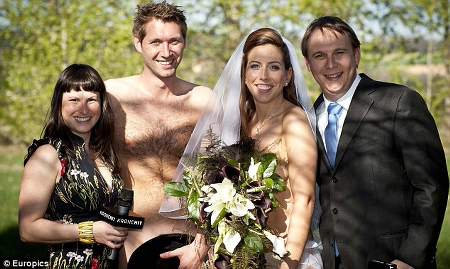 Những khách dự đám cưới của đôi uyên ương Melanie Schachner - 26 tuổi và Rene Schachner - 31 tuổi tại Áo vô cùng sửng sốt khi chứng kiến cô dâu, chú rể khoả thân trao lời hẹn thề. Cô dâu Melanie cho biết: “Chúng tôi không xấu hổ về cơ thể của mình và chúng tôi muốn làm điều gì đó thật đặc biệt trong ngày cưới. Việc chúng tôi khoả thân quả thật khiến các khách mời không thể quên được ngày cưới của chúng tôi”. Ý định khoả thân được cô dâu và chú rể giữ kín tới mức ngay cả gia đình cũng không hề hay biết, cho đến khi đám cưới diễn ra.