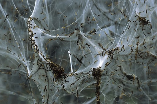 Thế nhưng lại gần, ta không khỏi kinh ngạc, khi lớp màng trắng kỳ ảo kia, thực chất được tạo nên bởi lớp màng bọc của hàng nghìn ấu trùng sâu bướm.