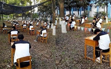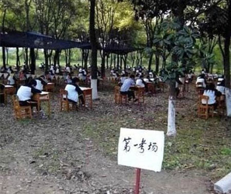 Theo Dailymail, một trường trung học nằm ở thành phố Cẩm Châu tỉnh Hồ Bắc Trung Quốc đã có ý tưởng này, với mong muốn giúp các học sinh vượt qua nắng nóng để làm bài tốt trong mùa thi học kỳ. Tất cả bàn ghế đều được di chuyển ra ngoài, học sinh hòa nhập với thiên nhiên nhưng tuyệt đối không được gian lận trong thi cử.