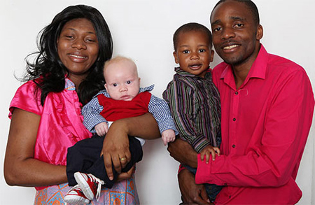 Gia đình anh Francis và hai đứa con, một đen, một trắng. Ảnh: Mirror.