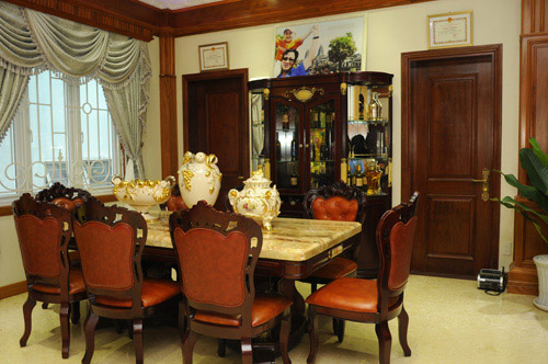 Toàn bộ nội thất gỗ trong nhà đều do một người bạn thân của ông xã Trang Nhung tặng. Nhiều đồ trang trí bằng gốm được chạm khắc tinh xảo, sang trọng cũng là quà mừng của nhiều bạn bè doanh nghiệp, quan chức của bạn ông xã Trang Nhung quý tặng. Đây là điều vinh hạnh của gia đình và chính vì thế mà ông xã Trang Nhung đã chọn lọc thiết kế rất kỹ từng tầng lầu, từng ngóc ngách trong ngôi nhà để trân trọng các món quà cũng như luôn tiện nghi, hiếu khách để chào đón bạn bè có dịp ghé thăm. Đây cũng là cách thể hiện sự quý trọng, lòng hiếu khách của gia đình anh chị.