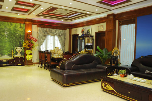 Ngôi nhà 100 tỷ này được khoác chiếc áo trắng sang trọng và thiết kế theo kiến trúc luật xây nhà của Cao Biền và Lỗ Ban xưa. 5 tầng được phân chia nhiều khu rõ rệt. Tầng hầm để xe, tầng G là phòng khách sang trọng rộng rãi của cả gia đình. Bên trái và bên phải của ngôi nhà đều có bàn ăn lớn và bàn ăn nhỏ dành cho các thành viên gia đình hay quan khách.
