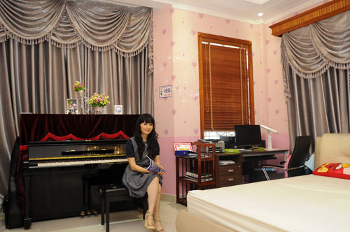 Ngay lối vào phòng ngủ của hai vợ chồng là một bức tranh thiên nhiên thật lớn và tươi sắc. Một tủ kệ lưu giữ các album đã phát hành, các hình ảnh khi nhỏ của Trang Nhung được đặt phân chia phòng khách và phòng trang điểm.