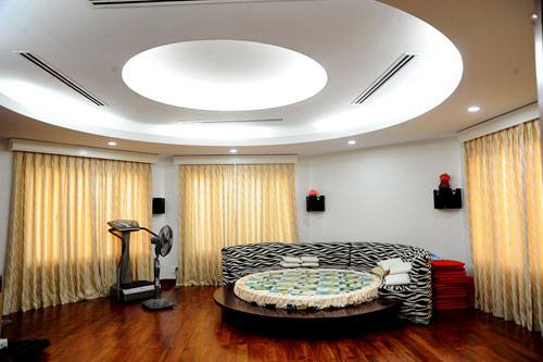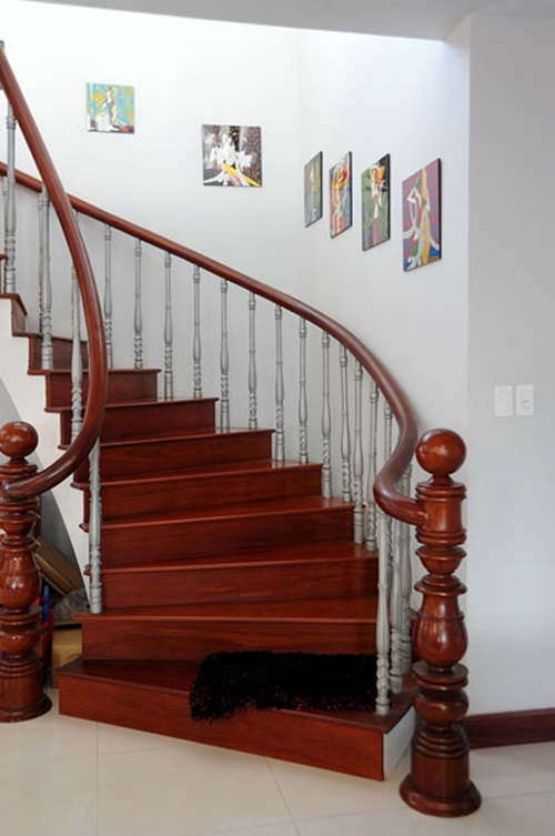 Phòng ngủ của chủ nhân khá rộng có một chiếc sô-pha giường hình tròn đặt trên nền lót bằng gỗ mun. Một chiếc cầu thang bằng gỗ có trang trí những bức tranh xinh xắn trên tường dẫn lên tầng hai.